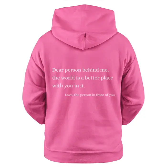 Spread kindness effortlessly with this unique hoodie. The simple yet profound message, “Dear Person Behind Me, the World Is a Better Place With You in It. Love, the Person in Front of You,” is a subtle act of positivity, designed to brighten someone’s day. It’s a quiet reminder to the recipient that they are valued and appreciated, a small gesture that can make a big difference in a busy, often impersonal world. Imagine the smile it might bring to a stranger’s face, a quiet act of acknowledgment in the chaos of daily life. It’s more than just clothing; it’s a silent declaration of hope and human connection.